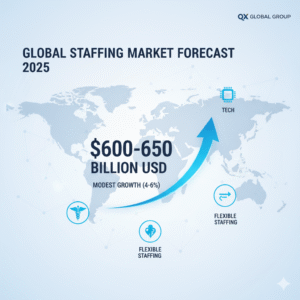 - Global staffing market: Forecasts for 2025 project low-to-mid single-digit growth versus 2024, with industry reports estimating the global staffing market in the hundreds of billions (estimates commonly cited around $600–$650B depending on methodology). Growth is driven by tech, healthcare, and flexible staffing demand. QXGlobalgroup –+1